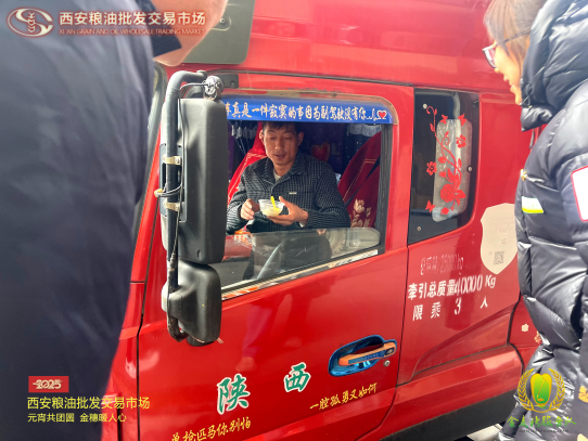“金麥穗”服務(wù)隊(duì)還特別為外地大貨車司機(jī)送上了暖心湯圓。這些大貨車司機(jī)常年奔波在外,很難和家人一起過節(jié)。當(dāng)他們收到這份特別的節(jié)禮時(shí),眼中滿是感動(dòng)。一位司機(jī)師傅說:“雖然不能回家,但在這里感受到了家的溫暖,更感受到了千年古都西安人民的熱情,謝謝糧油市場對我們的關(guān)心。”